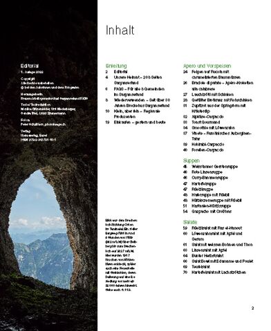 Wie bereits beim ersten Band, stehen ausgesuchte Lieblings- und Alltagsrezepte sowie Personenportraits und Landschaftsfotos aus dem Sarganserland im Fokus. 113 Rezepte und über 160 grossformatige Bilder auf 208 Seiten: «Ein Muss für alle Sarganserländerinnen und Sarganserländer und solche, die es werden möchten.»